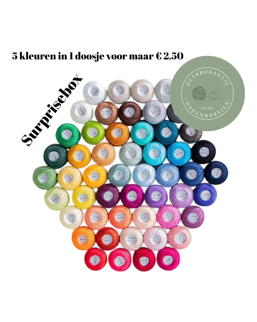 Een surprise box bevat 5 snoepige bolletjes Candy Floss garen in willekeurige een kleurencombinatie.